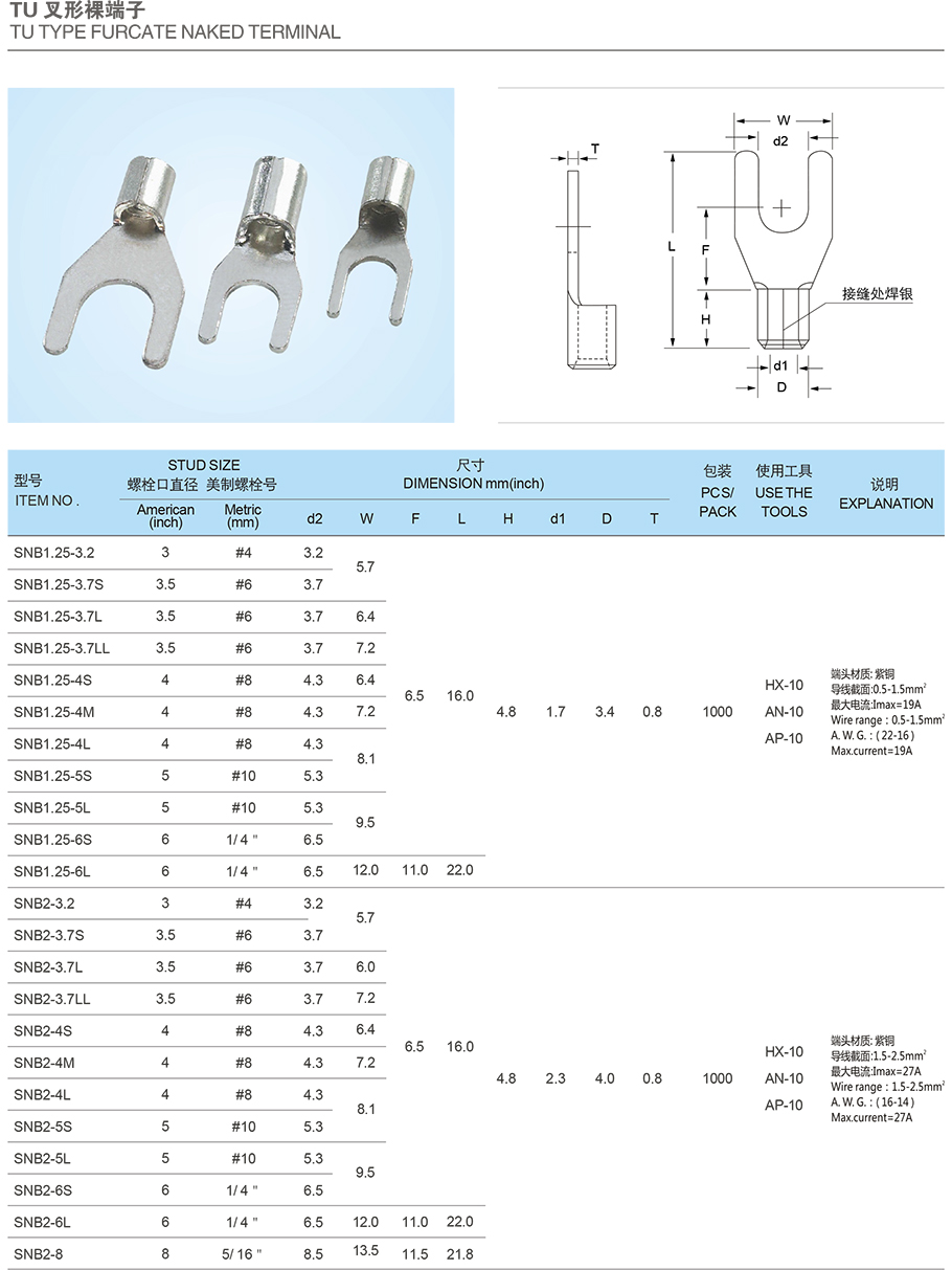 SC(JGY)、SC(JGB)引进窥口三角型,喇叭型铜线接线端子