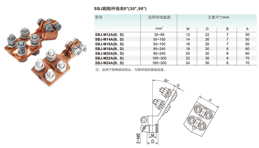 产品名称:SBJ铜抱杆线夹0°(30°,90°)
