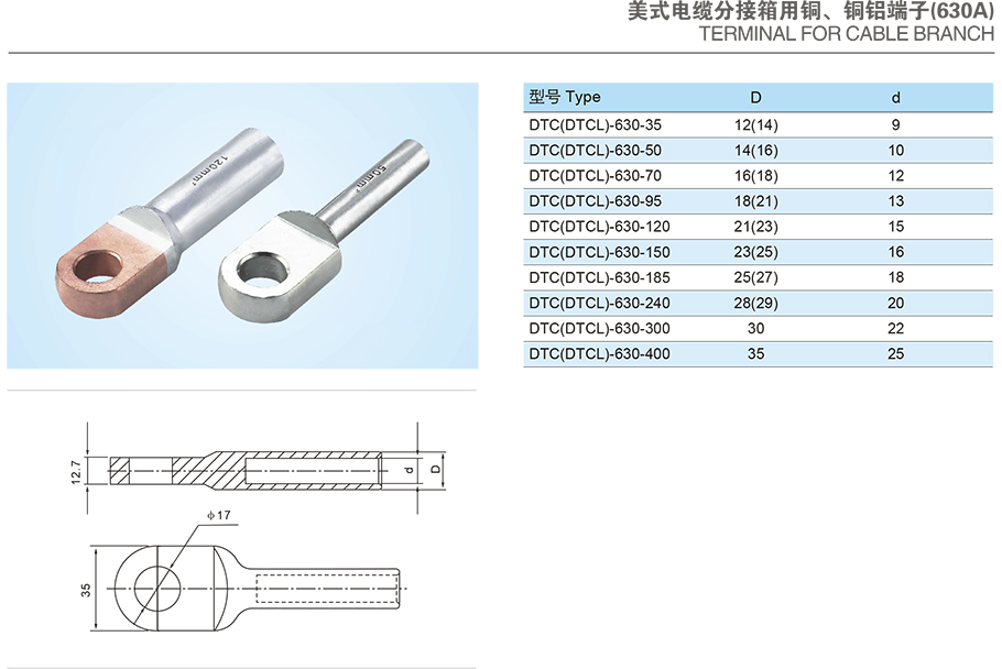产品名称:美式电缆分接箱用铜、铜铝端子(630A)