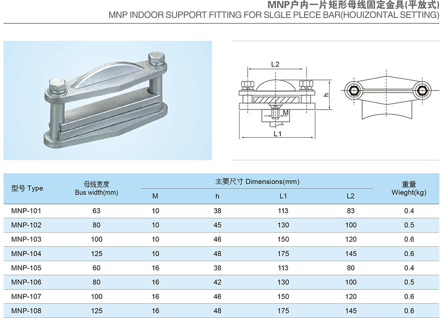产品名称:MNP户内一片矩形母线固定金具(平放式)
